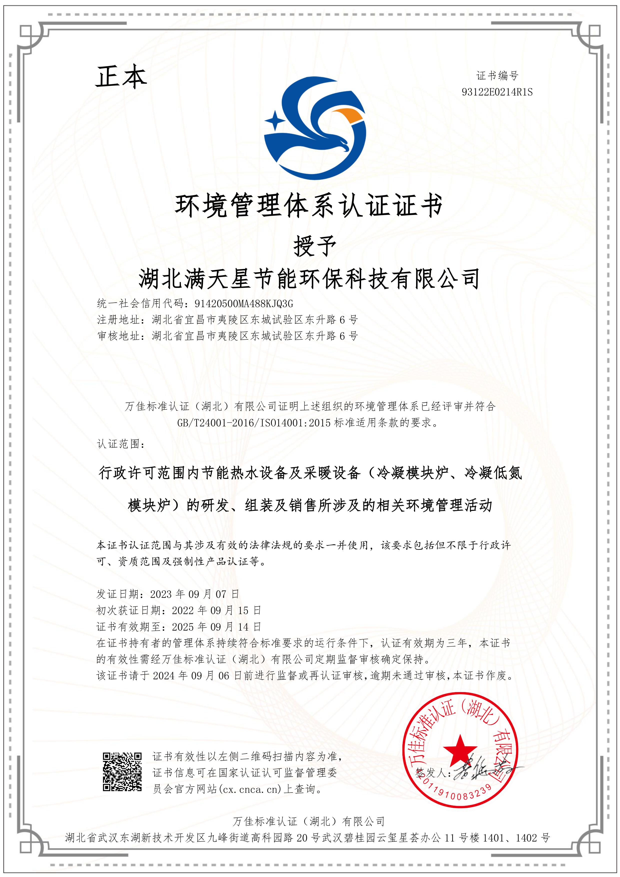 环境管理体系认证证书