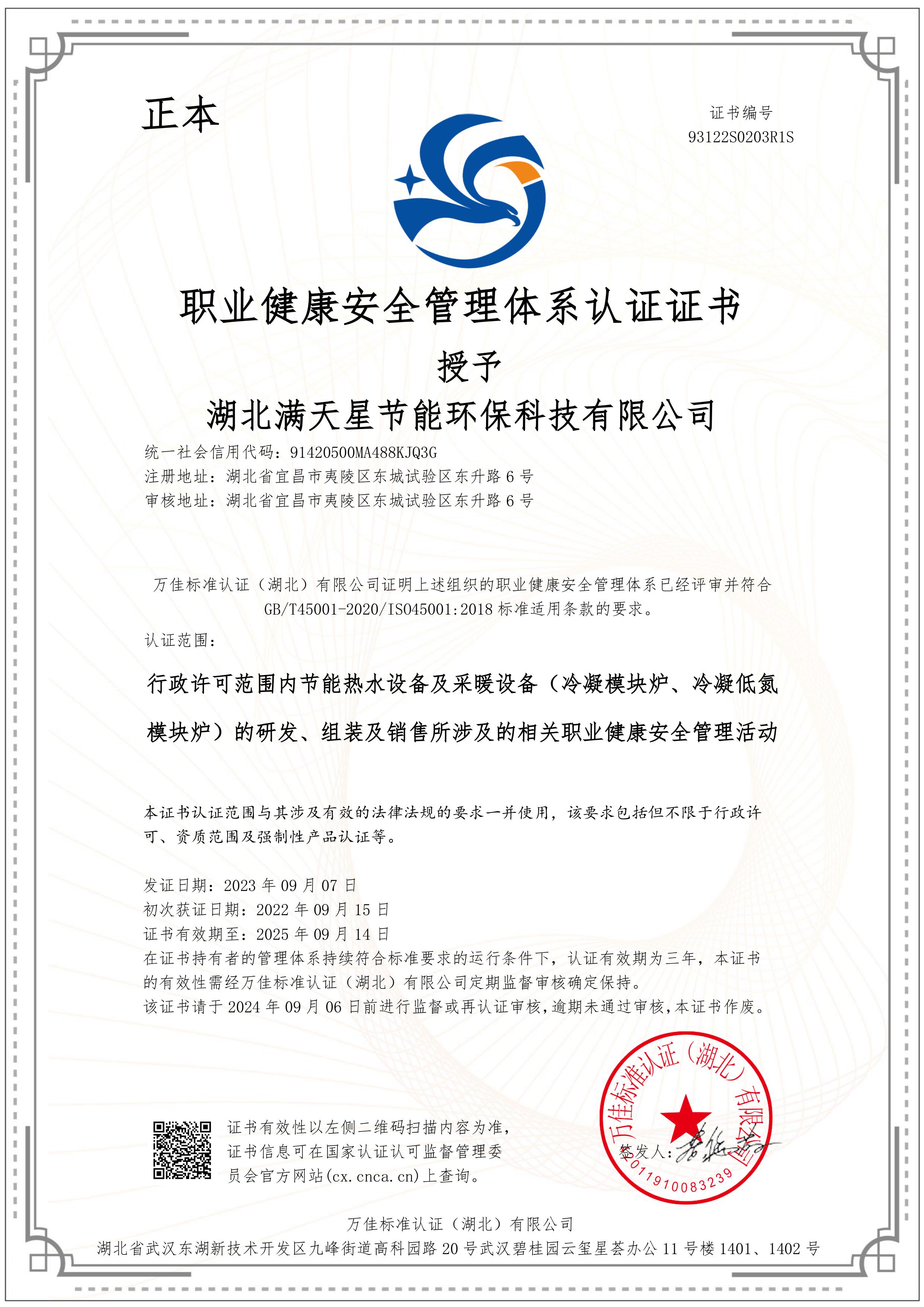 职业健康安全管理体系认证证书